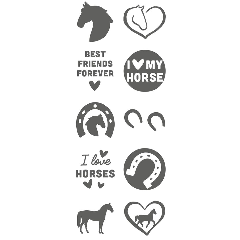 In diesem Set sind 10 verschiedene Stempelplatten enthalten, die zum Thema Pferde passen, einfach austauschen