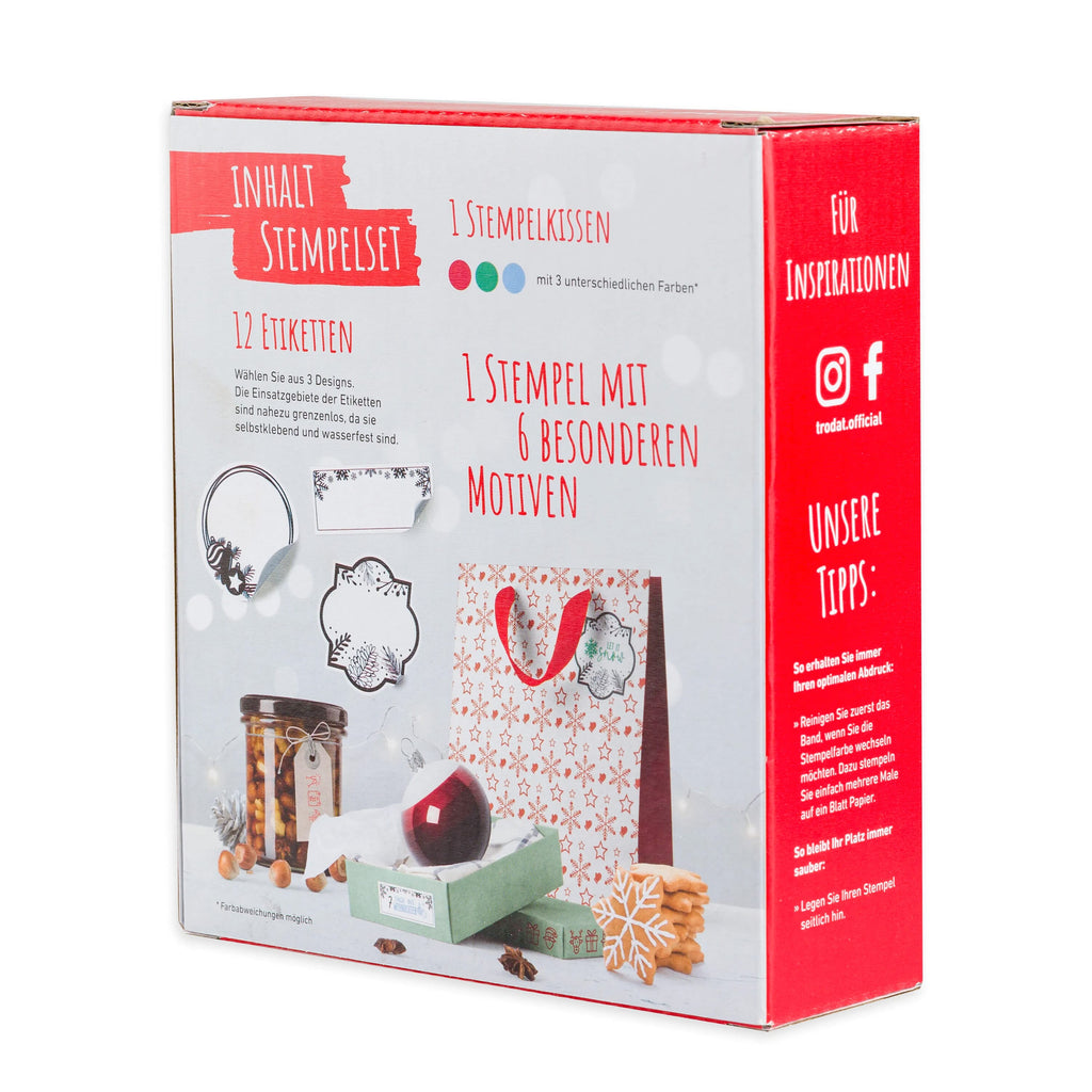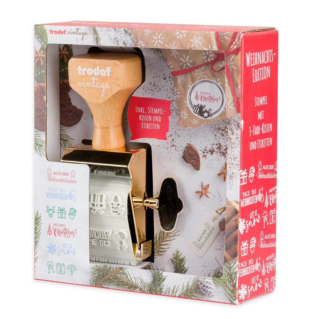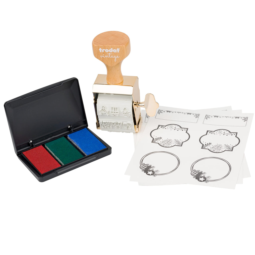Timbre Vintage Trodat avec 6 motifs spéciaux sur le thème de l'hiver/Noël, incluant 1 tampon encreur manuel avec 3 couleurs (bleu, vert et rouge) et 12 étiquettes thématiques.