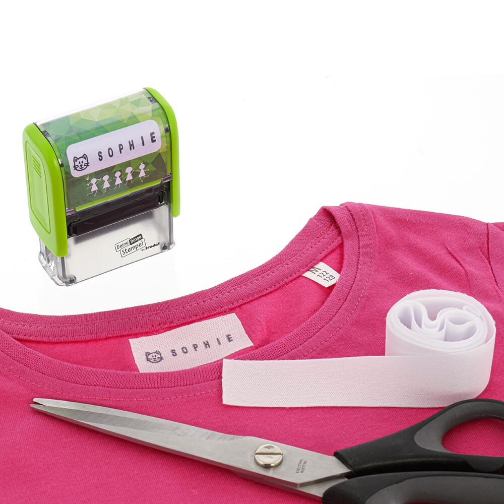 - Tamponnez le nom de vos enfants directement dans les vêtements, étiquetez avec les étiquettes nominatives Trodat la gourde, la boîte à lunch, la coque de téléphone et bien plus encore – idéal pour l'école et la maternelle