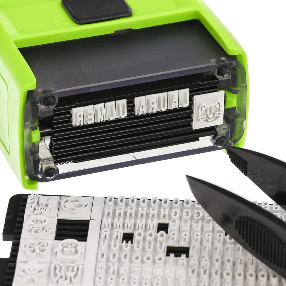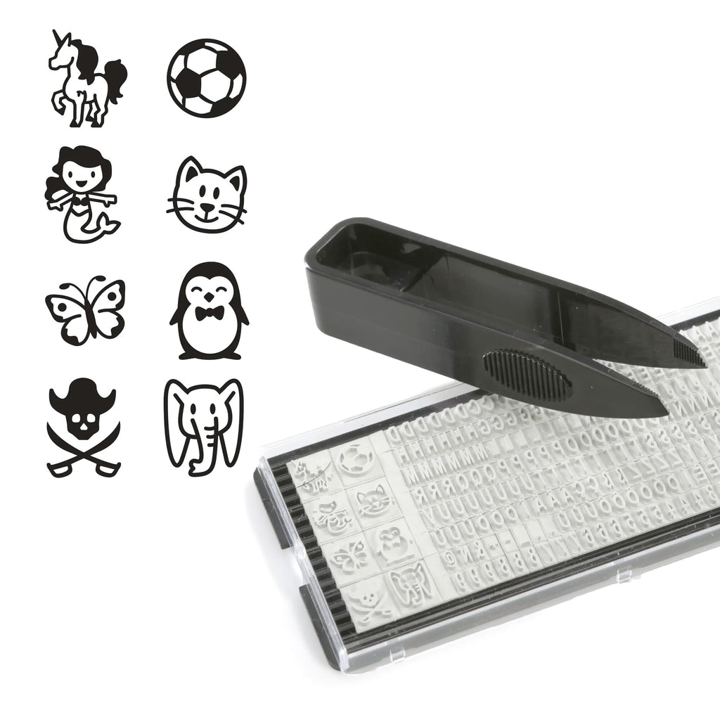 - Tampon simple à composer soi-même et facile à modifier rapidement – Contient le tampon avec coussin encreur noir, 1 jeu de lettres et chiffres incl. motifs pour enfants, 30 étiquettes imperméables, 1 mètre de toile thermocollante ainsi qu'une pince à épiler