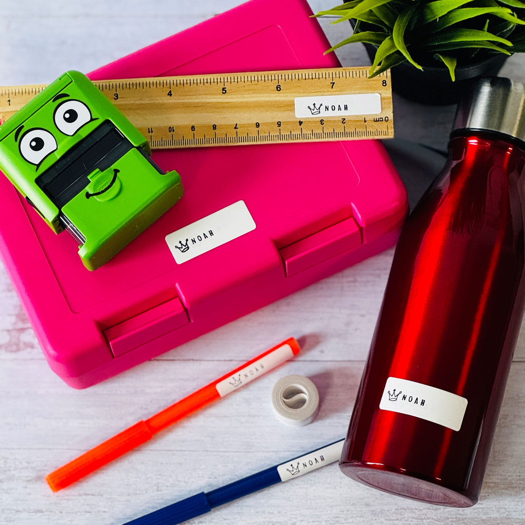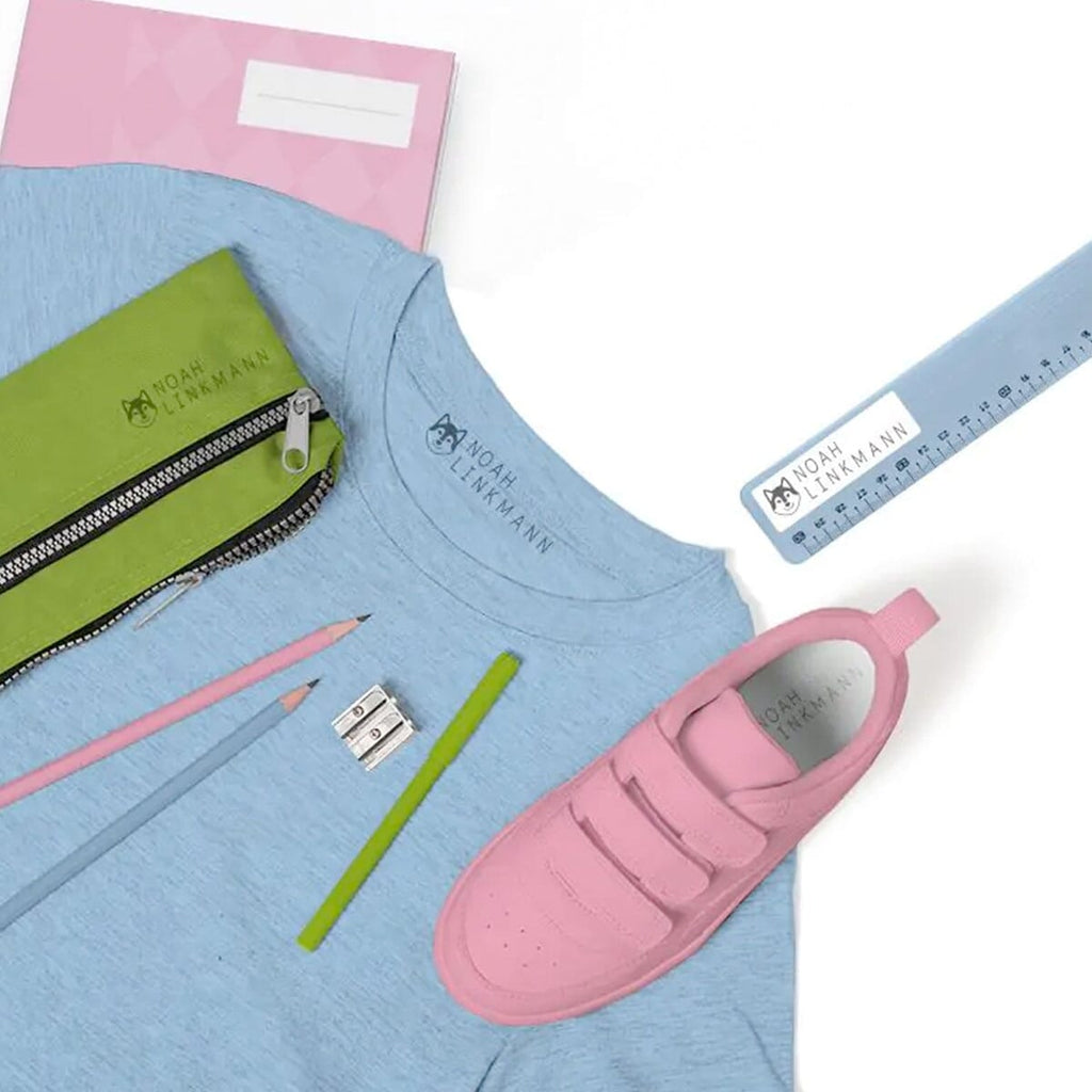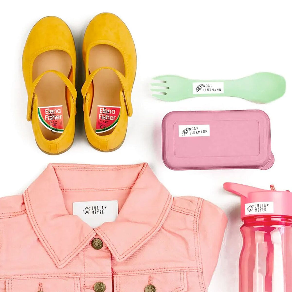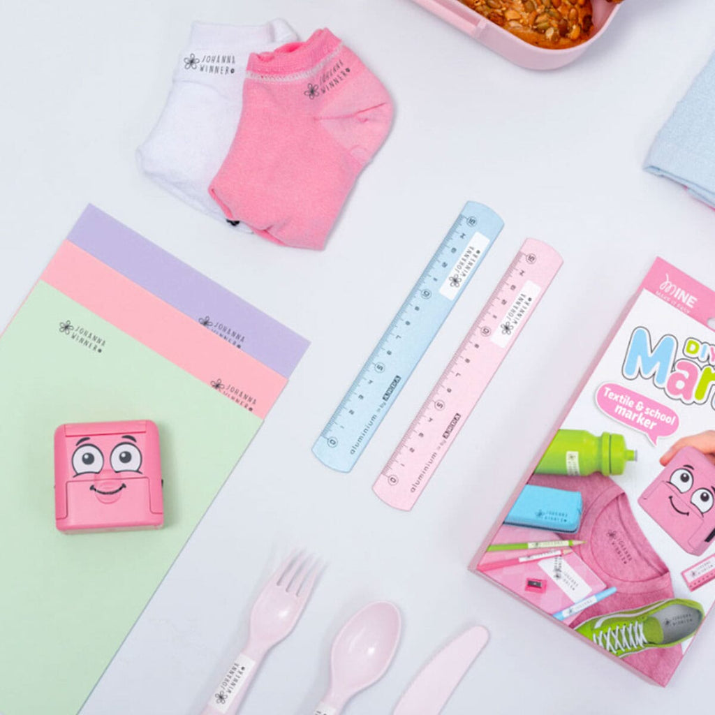 MARKY kann direkt auf hellen Stoffen, Papier, Karton, Schuhen und auf allen saugfähigen Oberflächen verwendet werden. Für die Personalisierung von dunklen Stoffen enthält das Set ein 1 Meter langes Thermo Bügelband, das nach dem Stempeln aufgebügelt wird. Trinkflaschen, Brotdosen, Stifte, Scheren und viele andere Schulsachen, die nicht direkt bestempelt werden können, werden mit den MARKY-Etiketten personalisiert. Die Etiketten dürfen dann gemeinsam mit Trinkflasche und Co. in die Spülmaschine.