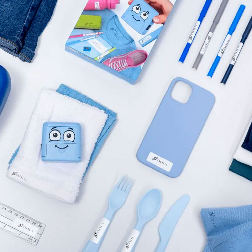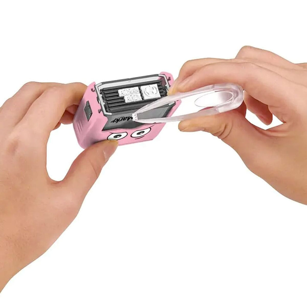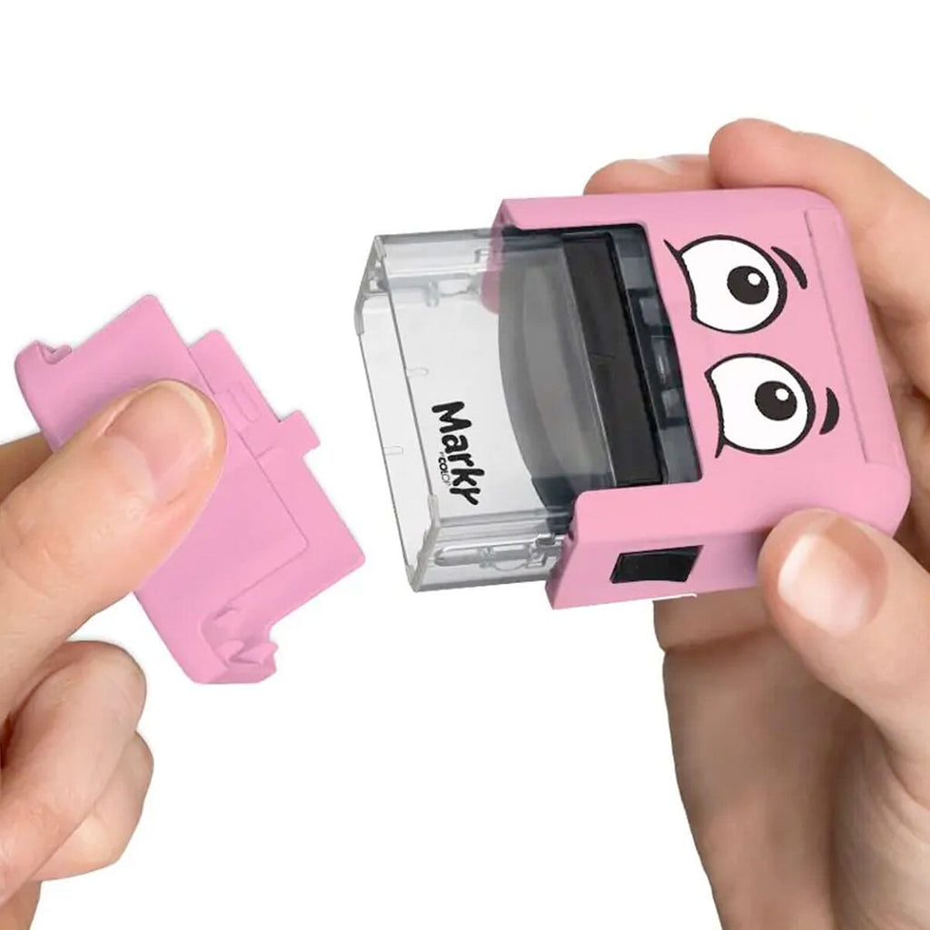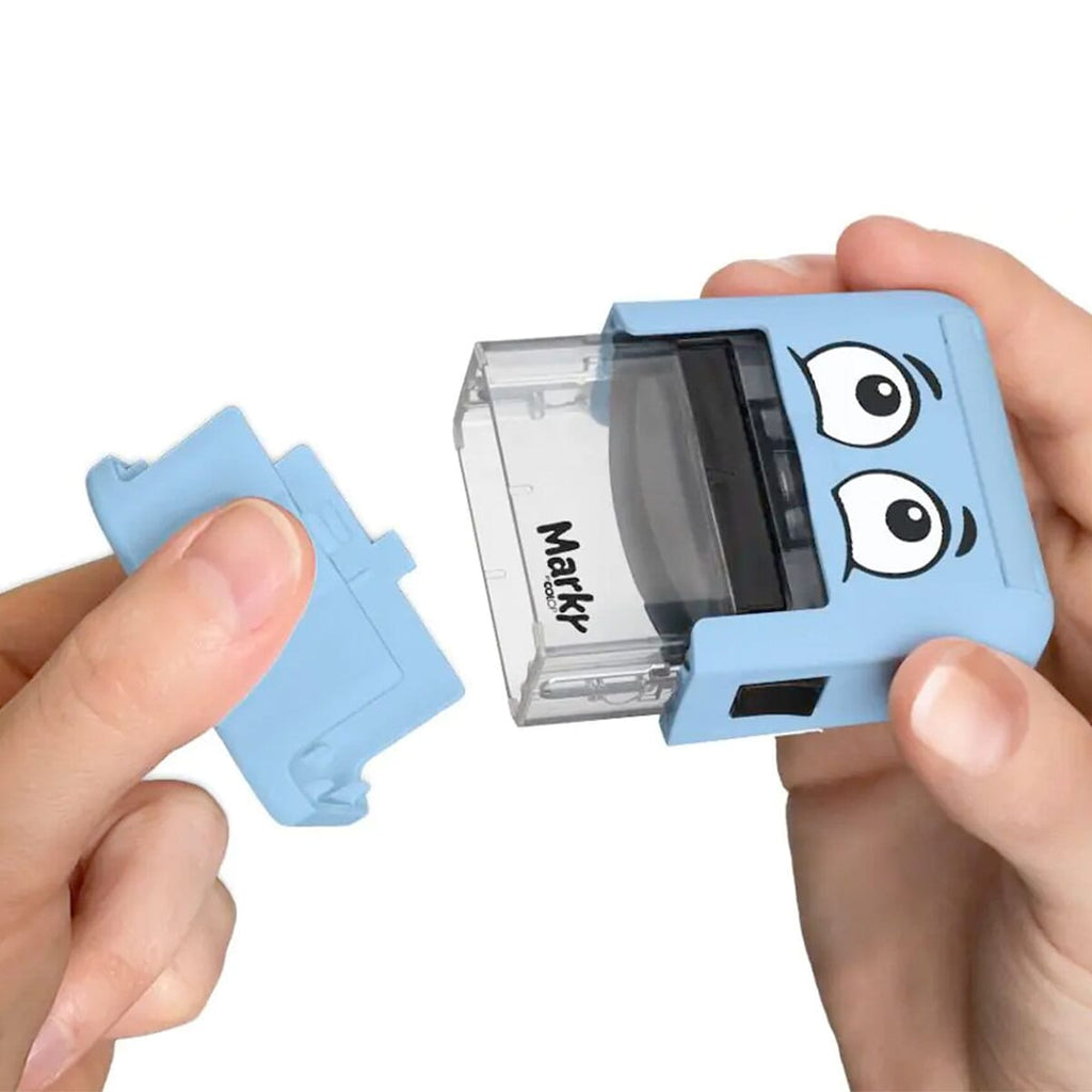 Marky, in Österreich produziert, gibt es in drei trendigen Farben: rosa, hellblau und grün. Das Set in einer attraktiven Kartonverpackung enthält den Stempel mit freundlichem Gesicht, einen Typensatz (mit allen Buchstaben des Alphabets und lässigen Piktos), eine Pinzette sowie ein Aufbügelband für dunkle Stoffe und spülmaschinenfeste Etiketten. Die beim Stempel enthaltene Abdeckung sorgt dafür, dass man ihn auch überall hin mitnehmen kann, ohne Gefahr zu laufen etwas zu verschmutzen.