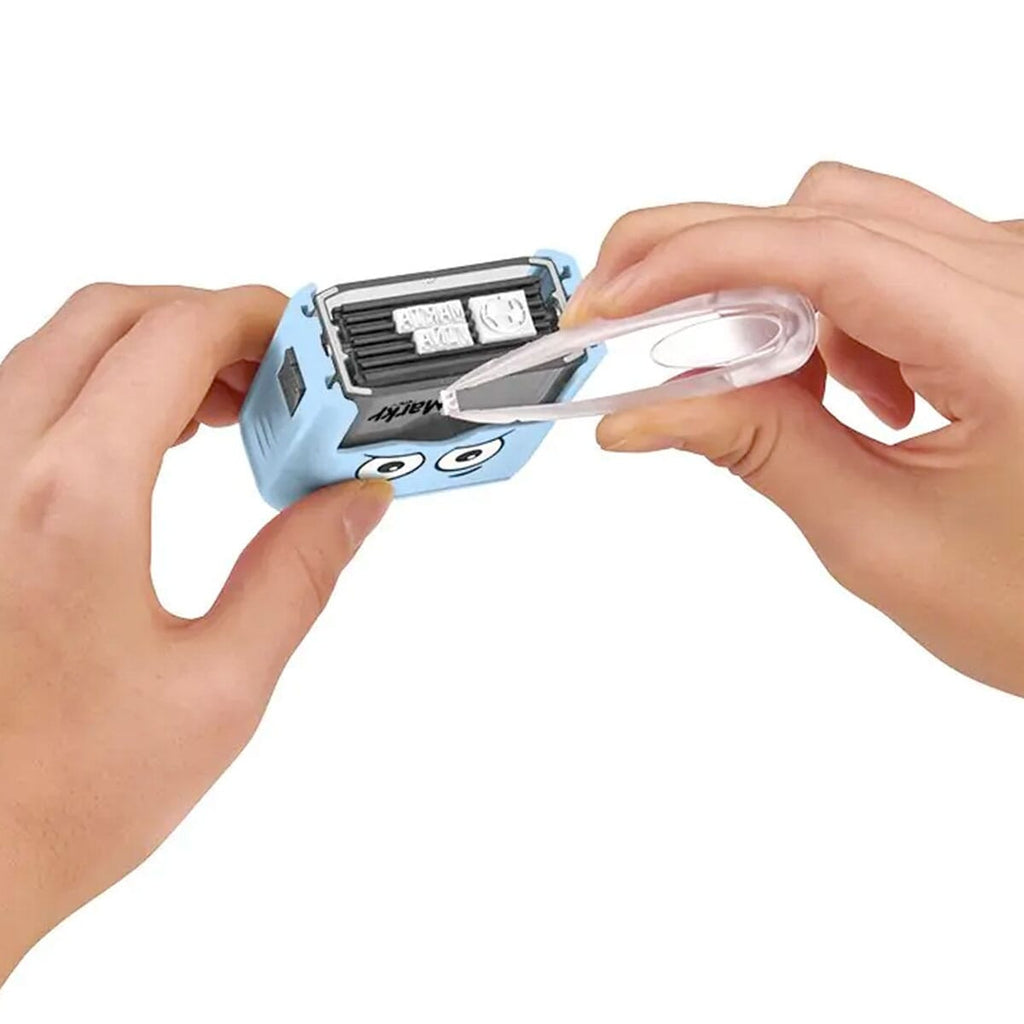 Einfach Marky aus der Verpackung nehmen, die Abdeckung entfernen und mit der beiliegenden Pinzette die im Typensatz enthaltenen Buchstaben und Piktogramme ganz einfach zum gewünschten Abdruck setzen. Ein klarer Vorteil ist, vor allem für Familien mit mehreren Kindern, dass dieser in wenigen Minuten immer wieder neu gestaltet und angepasst werden kann. Das schwarze Stempelkissen mit Textilfarbe ist bereits im Stempel eingesetzt.