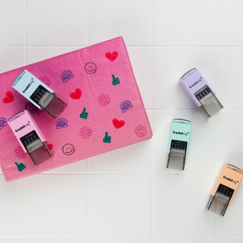 Die Trodat edy® Motivstempel sind die perfekte Wahl, um deine Wertschätzung und Anerkennung auf kreative Weise zu zeigen. Mit fünfzehn verschiedenen Gehäusefarben und fünfzehn einzigartigen Motiven – Blume, Daumen, Herz, Smiley, Regenbogen, Stern, Fee, Prinzessin, Einhorn, Schmetterling, Brontosaurus, Plesiosaurus, Stegosaurus, T-Rex und Triceratops – bieten diese Stempel zahlreiche Möglichkeiten, um kleine Botschaften zu hinterlassen.