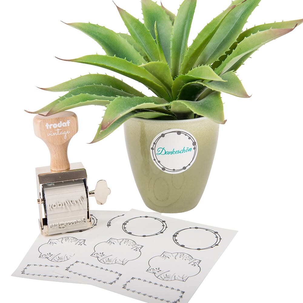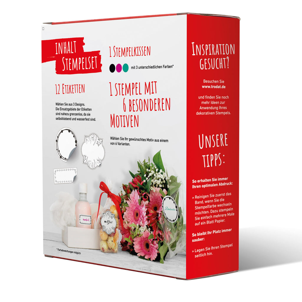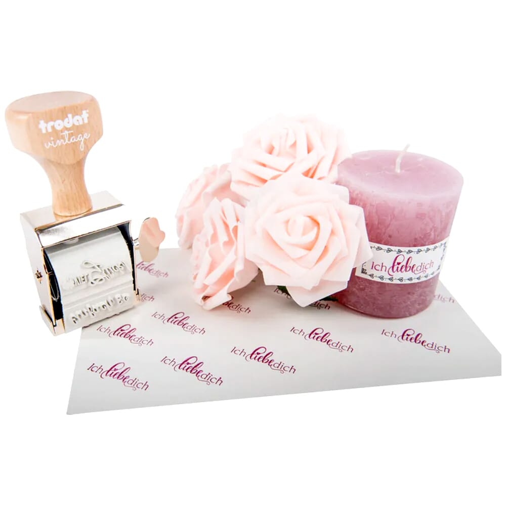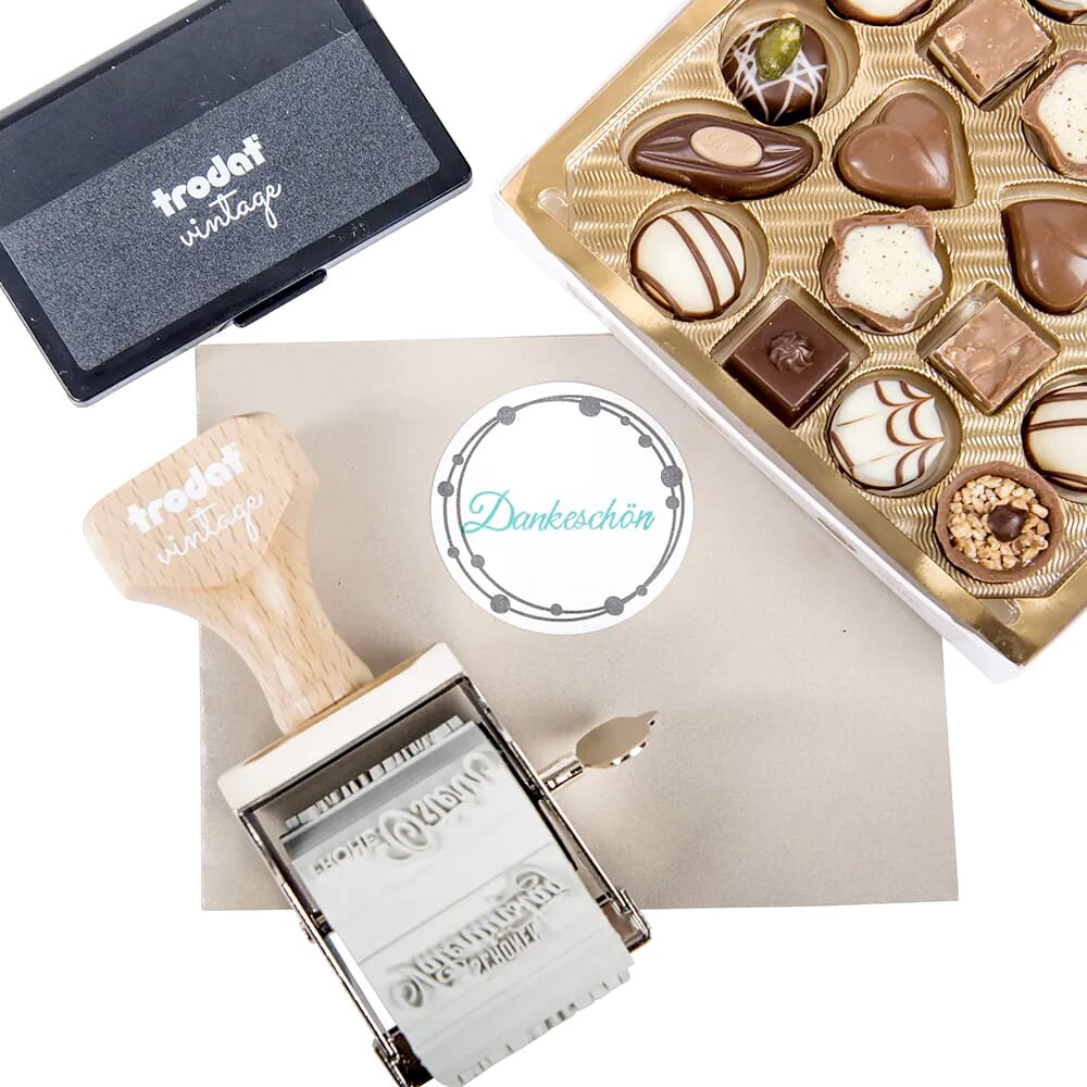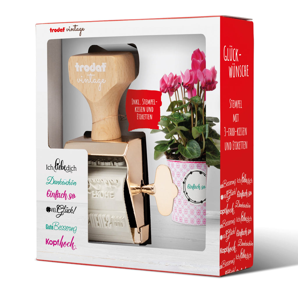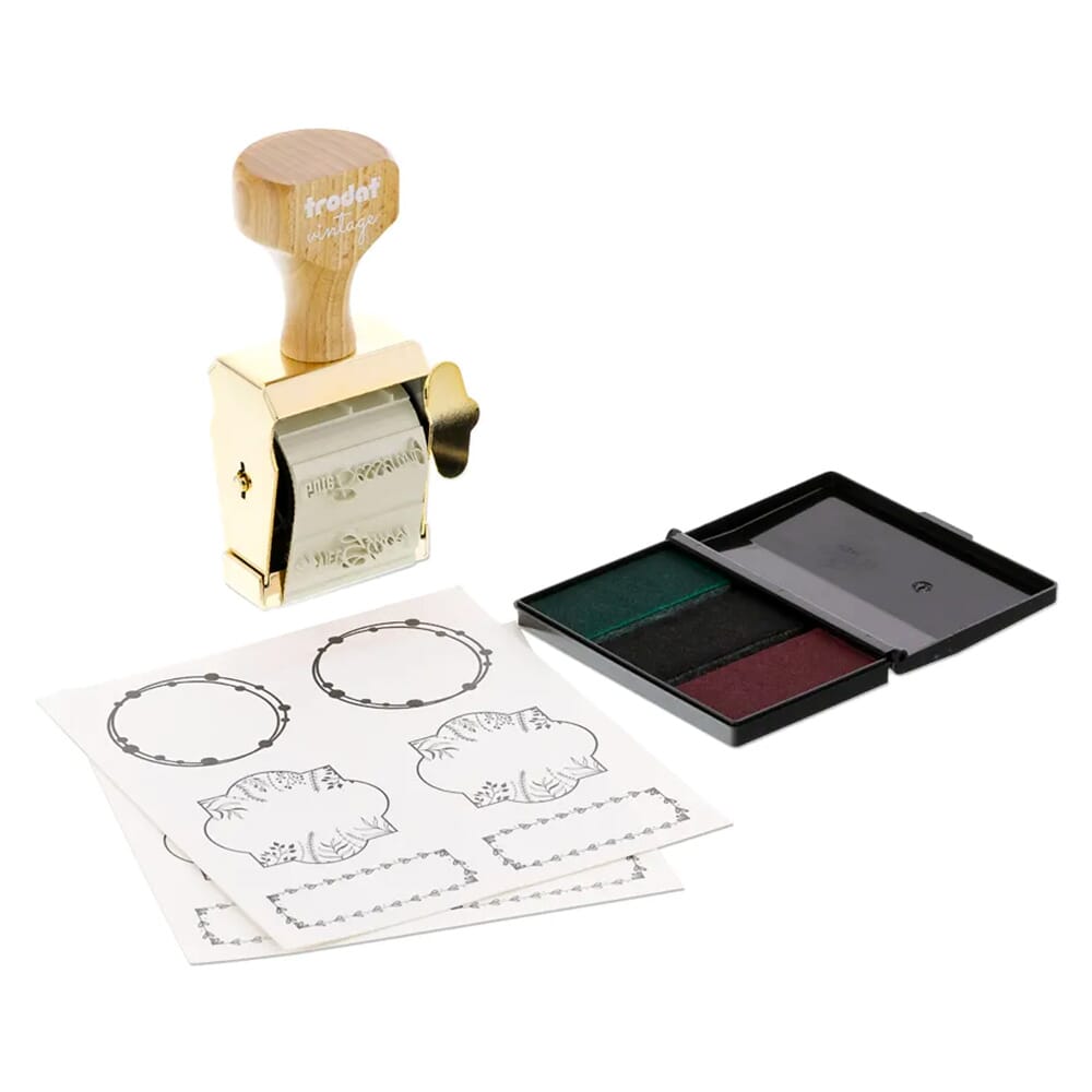 Trodat Vintage Stempel mit 6 besonderen Motiven zum Thema 1 Handstempelkissen mit 3 Farben (schwarz, grün und purpur) und 12 anlassbezogener Etiketten.
