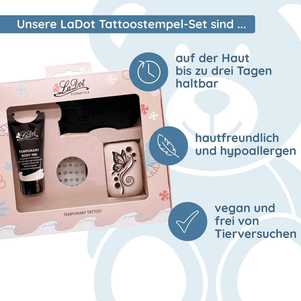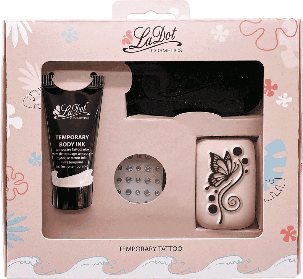 - Ensemble complet - Avec l'ensemble de tatouage LaDot 8, vous obtenez tout ce dont vous avez besoin pour un tatouage temporaire. L'ensemble comprend un tampon à tatouage de taille moyenne, un tube de 15 ml d'encre noire hypoallergénique et résistante à l'eau, un tampon encreur de taille moyenne (7,5 x 3,5 cm) et 80 strass auto-adhésifs.
